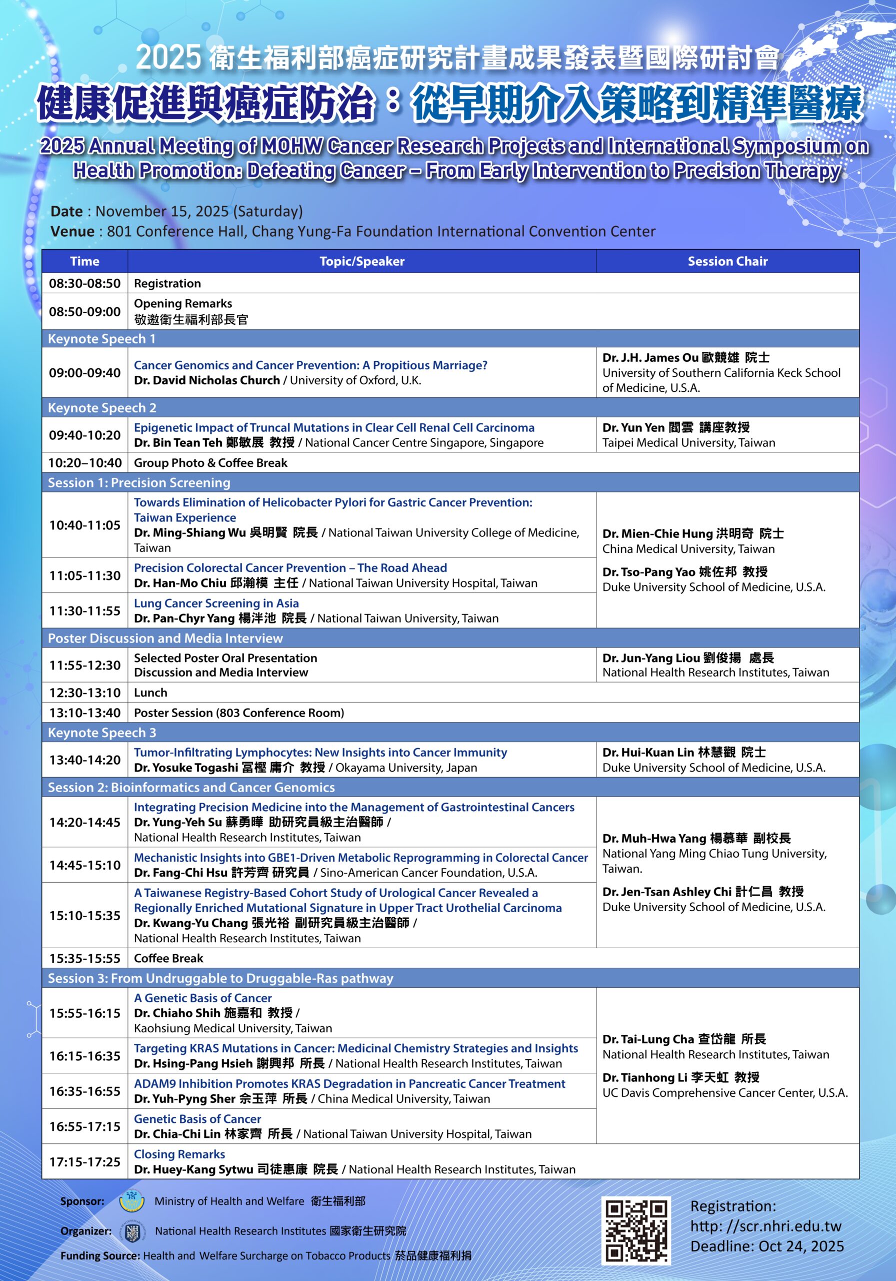 本院受衛福部補助協助其推動與管理跨機構合作的癌症轉譯研究計畫,將於11月15日(星期六)假 張榮發基金會國際會議中心801會議廳辦理「衛生福利部癌症研究計畫2025年成果發表會暨國際研 討會–健康促進與癌症防治:從早期介入策略到精準醫療」(2025 Annual Meeting of MOHW Cancer Research Projects and International Symposium on Health Promotion: Defeating Cancer-From Early Intervention to Precision Therapy),邀請 13 位國內外癌症研究專家進行演講,另亦邀請各跨機構合 作的癌症轉譯研究計畫下各執行團隊就其過去計畫執行成果發表壁報論文,並將挑選出數篇優秀壁 報論文發進行口頭簡報。歡迎踴躍報名參加。